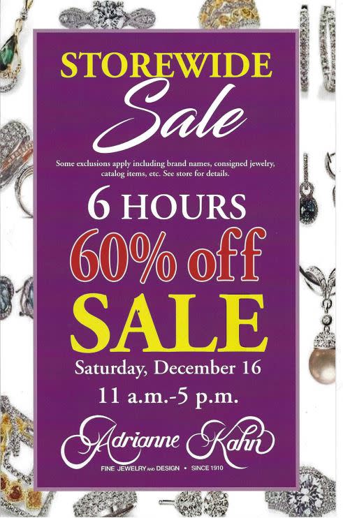From 11 am to 5 pm on Saturday, December 16th, Adrianne Kahn fine Jewelry will be offering a storewide 60% off sale. Some exclusions apply, see store for details.Images
