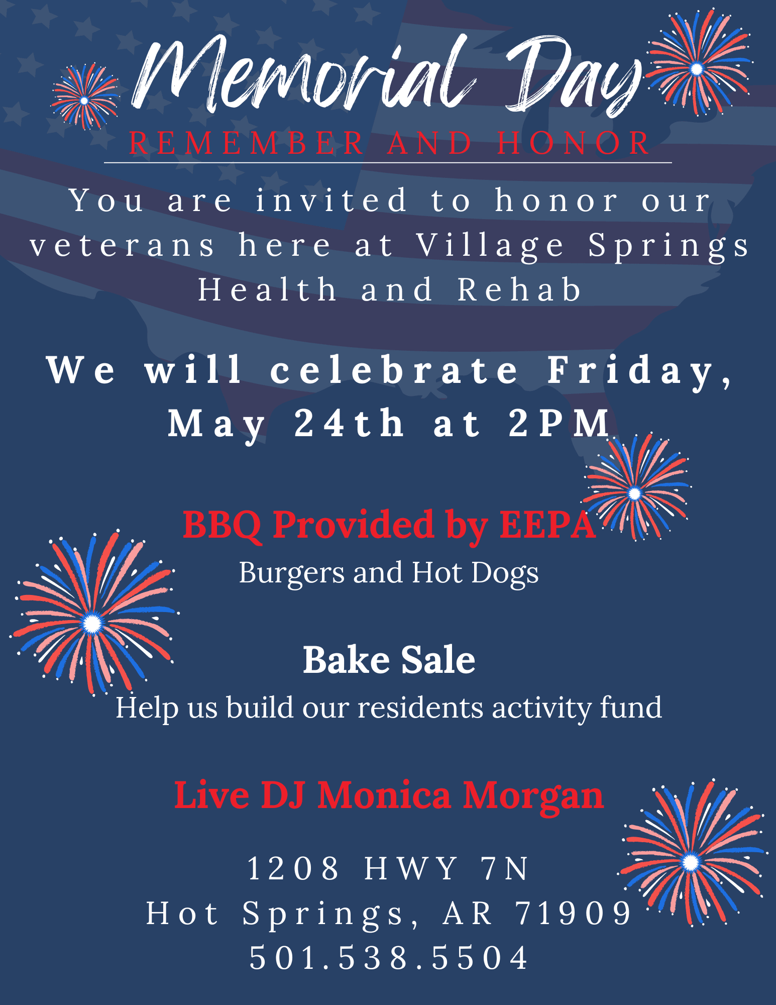 Join us at Village Springs Health & Rehabilitation to remember and honor our veterans on Friday, May 24th, starting at 2 PM. BBQ is provided by EEPA, live music is provided by DJ Monica Morgan, and a bake sale will be ongoing for our residential activity fund. We hope to see you there!